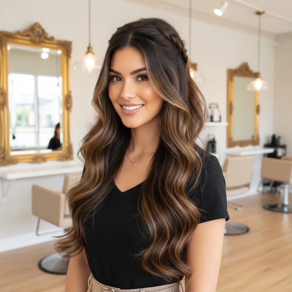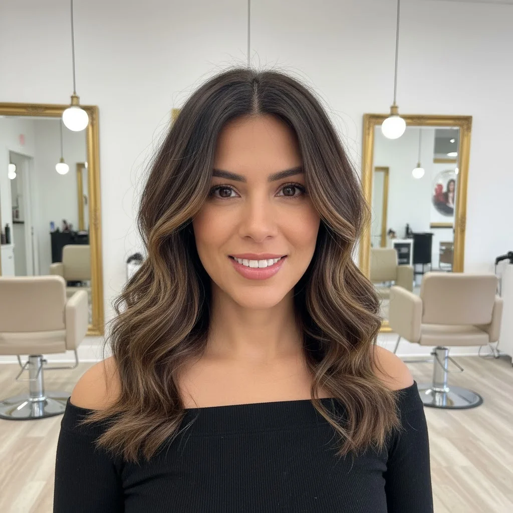 A timeless way to showcase your dark brown hair with light brown highlights is by creating soft waves. The natural movement in the waves brings out the dimension of your highlights, giving the hair a natural, sun-kissed look. This style is perfect for a relaxed, beachy vibe that you can rock at any time of the day.