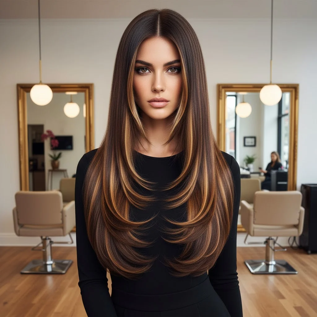For a dramatic effect, try long, sleek layers with bold light brown highlights scattered throughout. This high-fashion look creates an eye-catching contrast that adds a bold, modern feel to your hair. It’s perfect for events where you want your hair to be the main attraction.