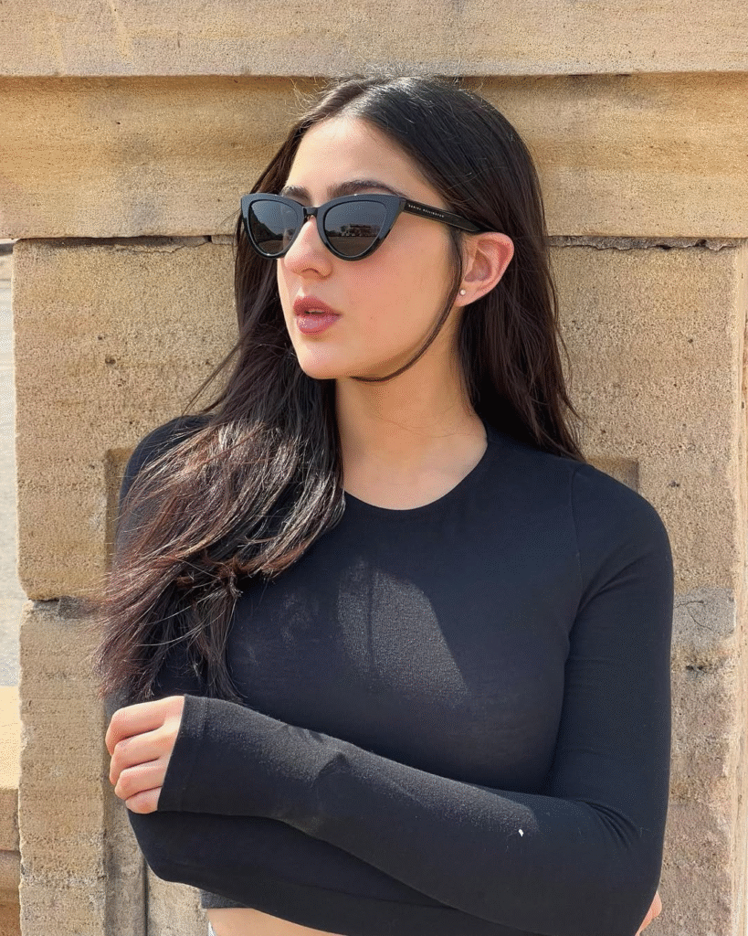 A classic black long-sleeve top exudes effortless style, hugging the body with a sleek fit. The simplicity of the top is elevated by the bold, cat-eye sunglasses, adding a touch of vintage glam to the modern look.