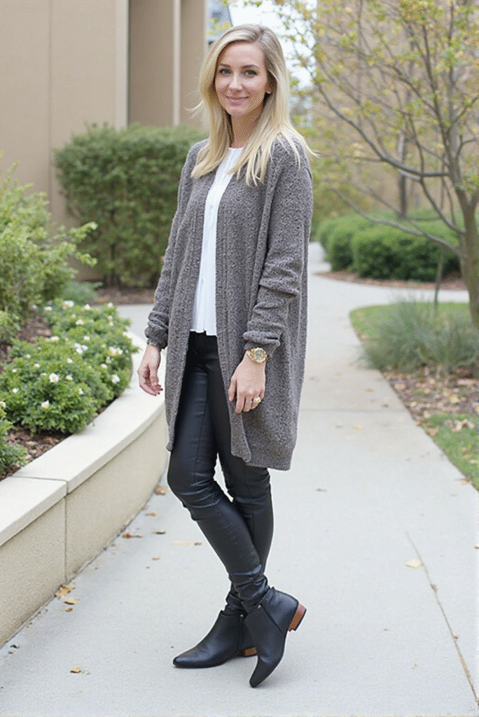 A cozy, textured grey cardigan drapes effortlessly over a classic white blouse, blending comfort with a modern edge. The loose fit of the cardigan contrasts beautifully with the sleek, black leather leggings, which add a touch of boldness to the otherwise relaxed outfit.