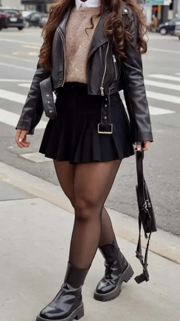 A classic black leather jacket adds a rebellious edge to this modern street-style look. Paired with a beige knitted sweater, it balances softness with boldness. The flared black skirt adds movement and contrast, creating a chic yet effortless vibe.