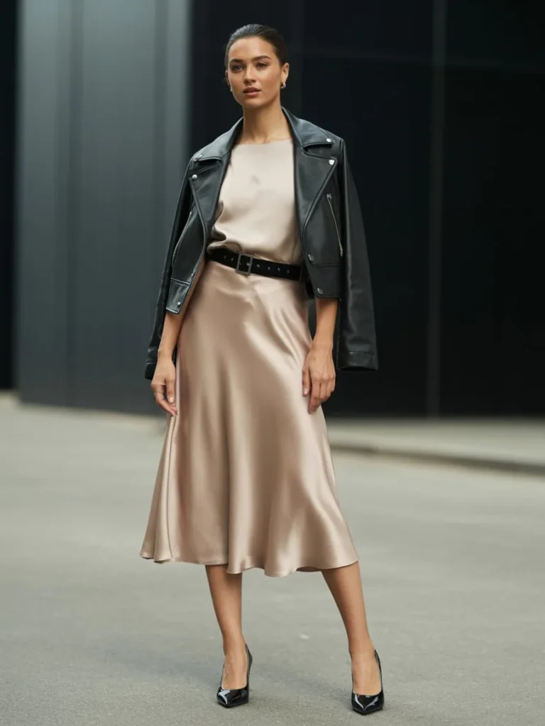 A satin slip dress in soft beige drapes elegantly, reflecting light with its smooth, luxurious fabric. The dress is cinched at the waist with a bold black belt, giving it structure and definition. Paired with a classic black leather jacket, the outfit combines feminine elegance with a rebellious edge.
