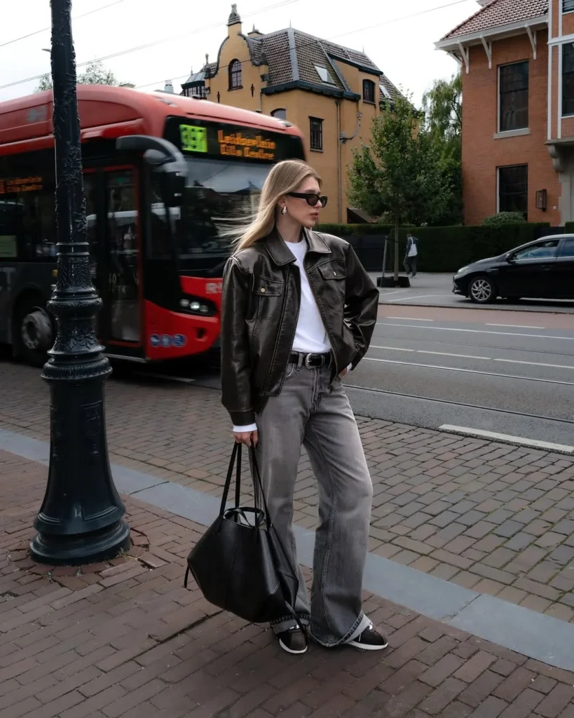 A chic brown leather jacket, paired with a simple white t-shirt, exudes an edgy yet refined vibe. The jacket’s vintage feel contrasts perfectly with the modern, relaxed fit of the grey flare pants, creating a balanced look that blends both comfort and style.
