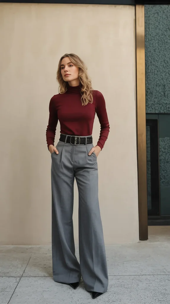 A deep burgundy turtleneck top brings warmth and elegance to this chic, sophisticated look. The slim fit complements the high-waisted, pleated grey trousers, which have a relaxed, wide-leg fit that adds a modern touch. The trousers’ sharp lines and the defined waistline create a perfect balance of structure and flow.