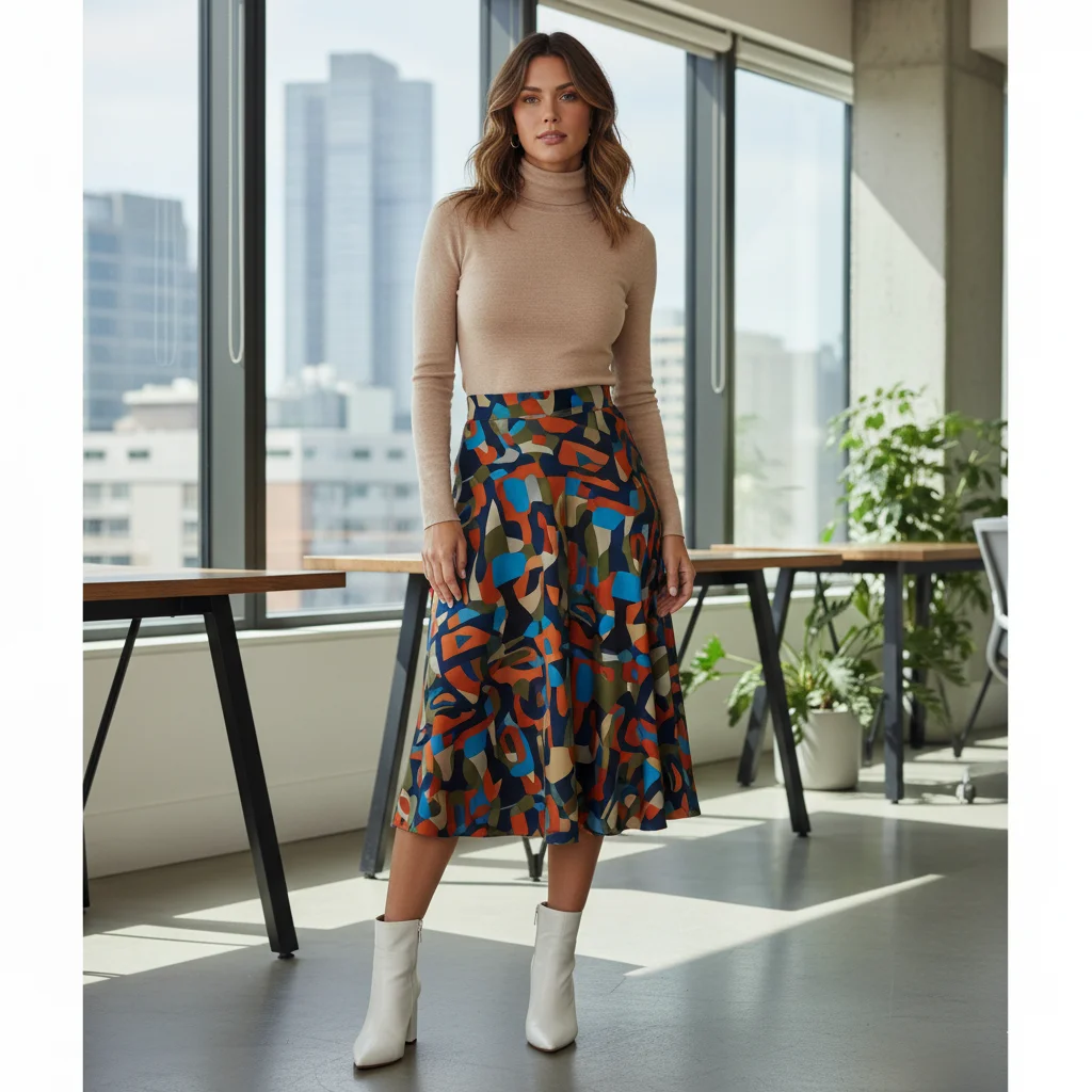 A soft beige turtleneck hugs the figure, creating a sleek and minimalist foundation for this chic outfit. The vibrant, geometric-patterned midi skirt adds an energetic contrast, with bold shades of red, blue, and green that infuse the look with color and movement.