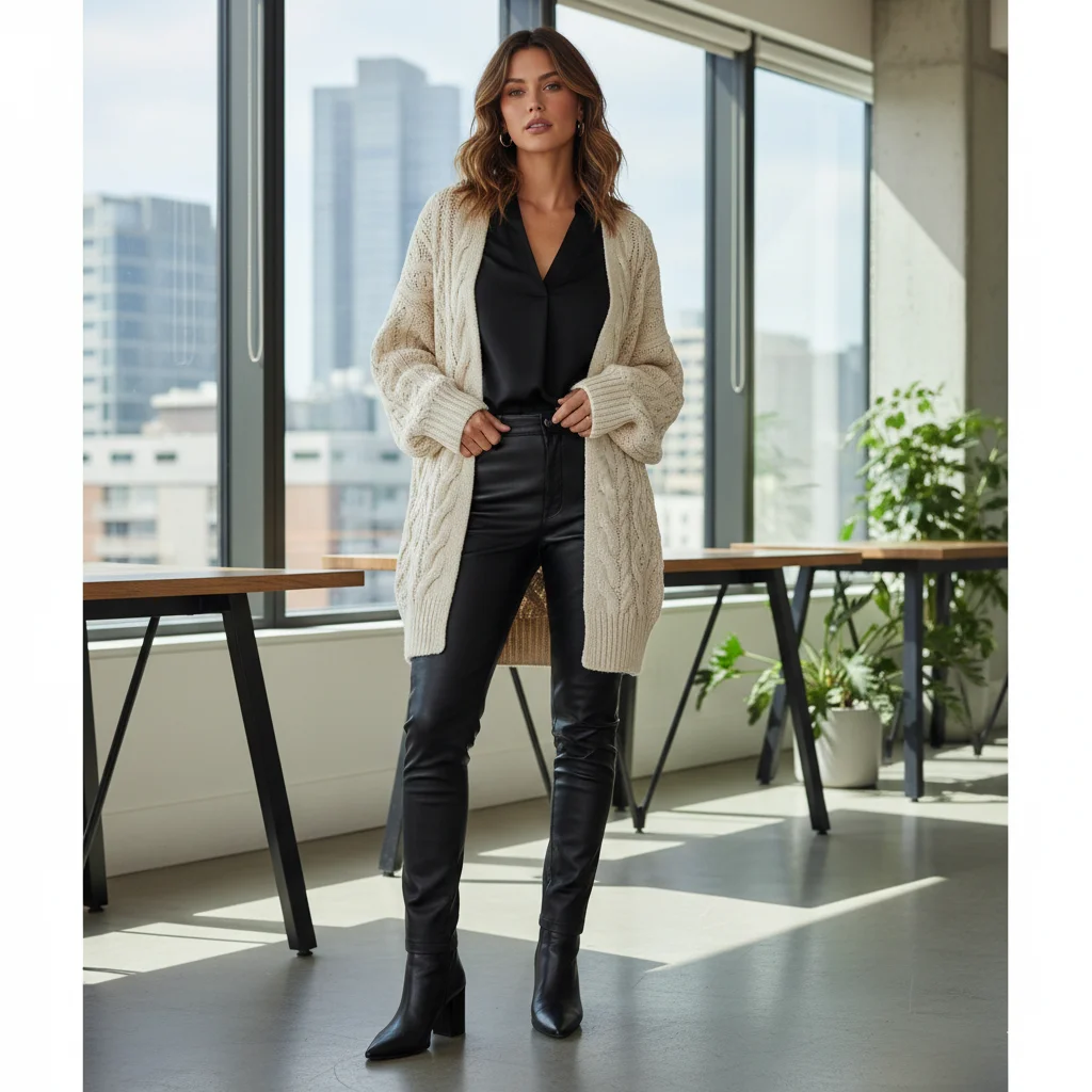 A cozy cream cable knit cardigan drapes effortlessly over a sleek black blouse, creating a stylish and layered look. The warm, textured cardigan contrasts beautifully with the form-fitting black leather pants, adding an edgy vibe to the otherwise soft outfit.