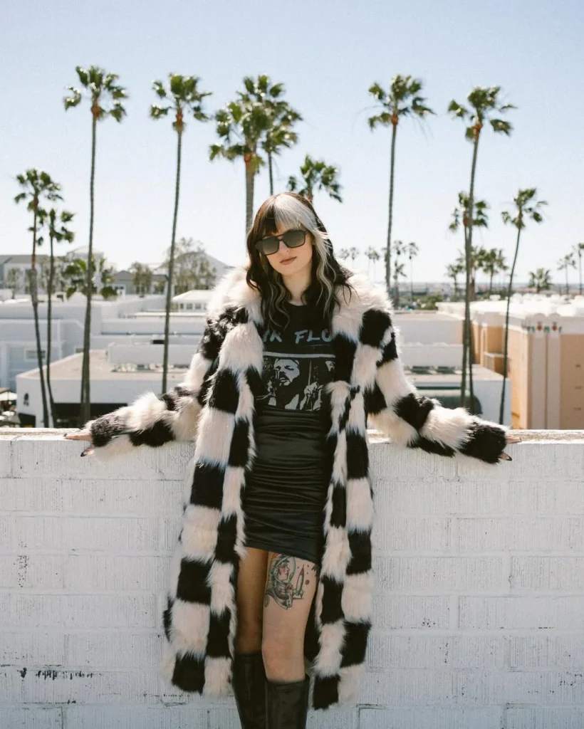 A black and white checkered fur coat takes center stage, exuding boldness and luxury with every step. Paired with a vintage graphic tee featuring Pink Floyd, this outfit effortlessly blends edgy with retro. The combination of the chic fur coat and casual tee creates a striking contrast, giving off a rebellious, yet refined vibe.