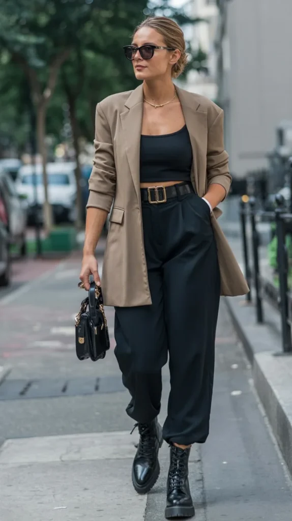 A tailored beige blazer effortlessly pairs with high-waisted black trousers, creating a sharp, sleek silhouette. The cropped black top beneath adds a touch of contemporary edge to the otherwise classic ensemble. The oversized blazer drapes perfectly, enhancing the outfit’s relaxed yet polished appeal.