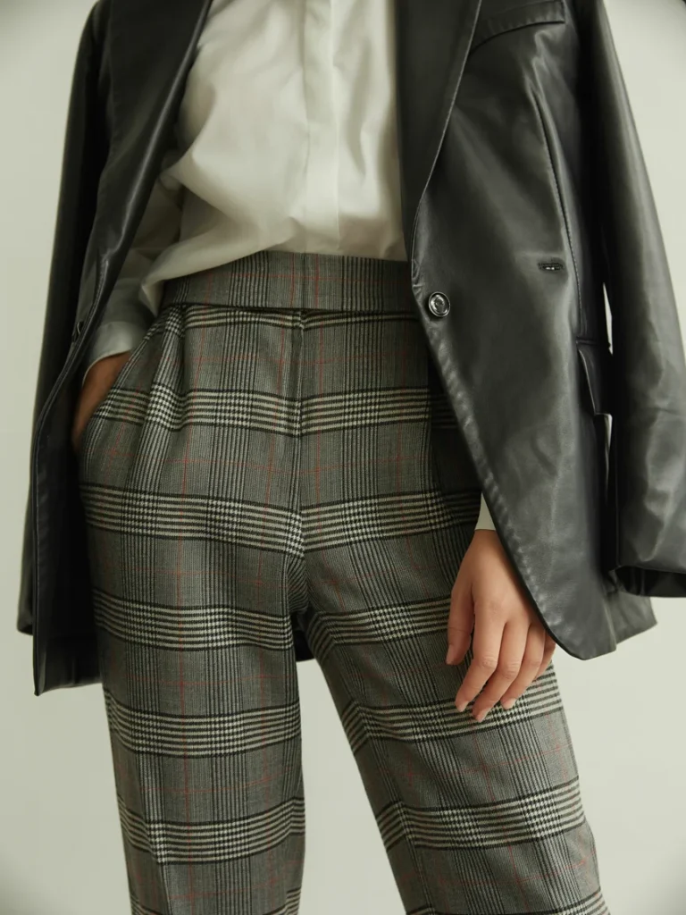 The loose-fitting trousers are tailored to perfection, offering comfort while still looking polished. The leather jacket adds an element of toughness, creating a balance between the softness of the shirt and the boldness of the plaid. This versatile outfit works well for both the office and casual outings, with its blend of structure and fluidity