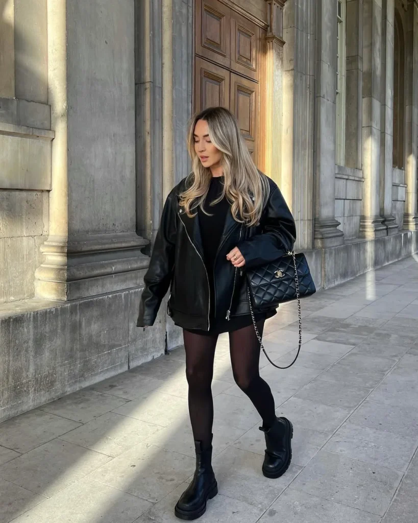 Pairing black tights with chunky black boots elevates the edgy feel of the outfit, providing both comfort and style. A classic black Chanel bag adds an element of sophistication, making this look perfect for both day and night outings.