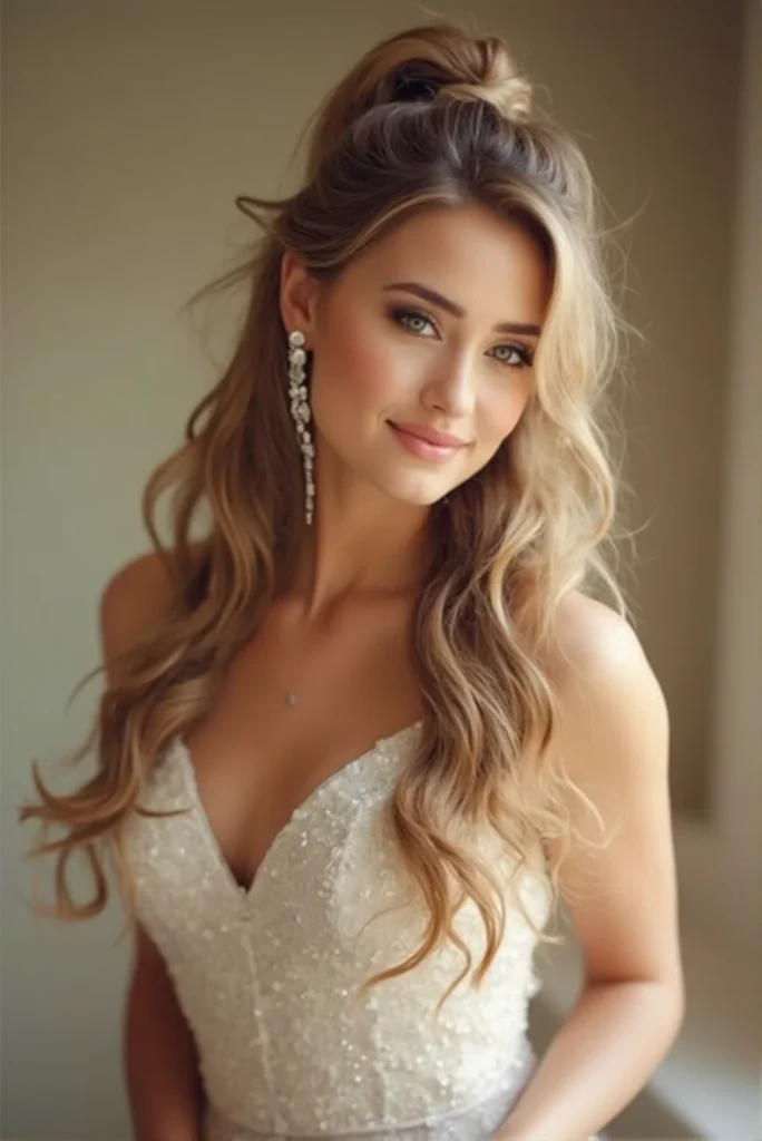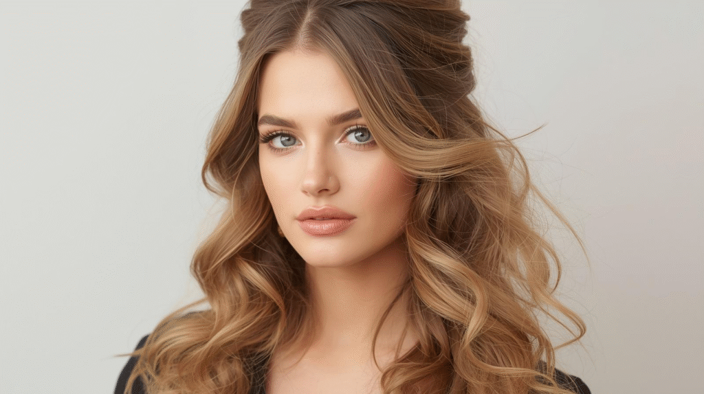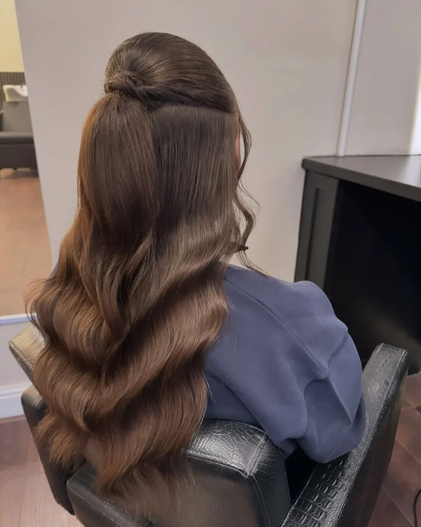 This half-up style brings a soft, glowing charm that works beautifully for any bridesmaid. Loose waves fall down the shoulders, giving the look a romantic flow that feels effortless and warm. A lifted crown section adds height and frames the face in a graceful way.