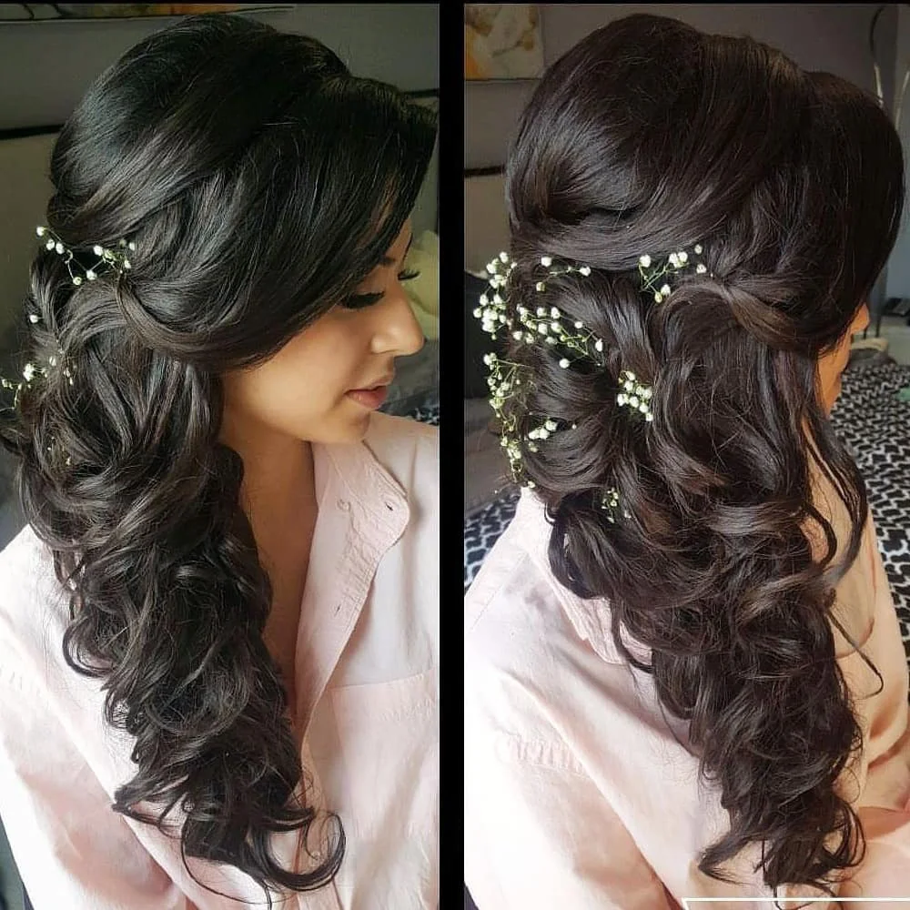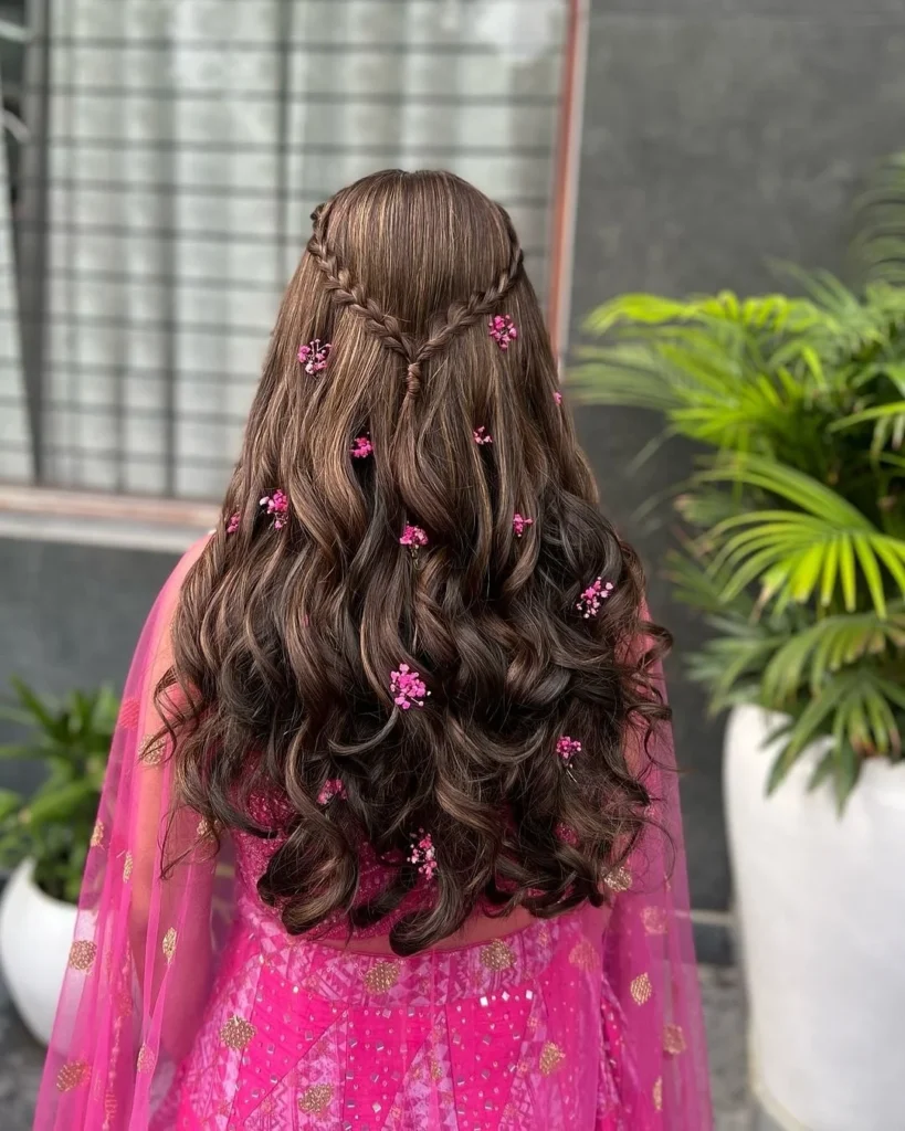 Bridesmaids often choose this look when they want something romantic yet effortless for long wedding days. With its blend of braids, waves, and floral accents, this hairstyle complements traditional, modern, and cultural weddings beautifully.