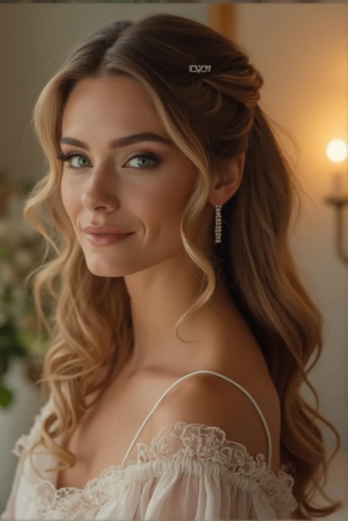 This soft half-up hairstyle brings a warm, glowing charm to any bridesmaid look. Loose waves fall naturally over the shoulders, creating movement that feels graceful and light.