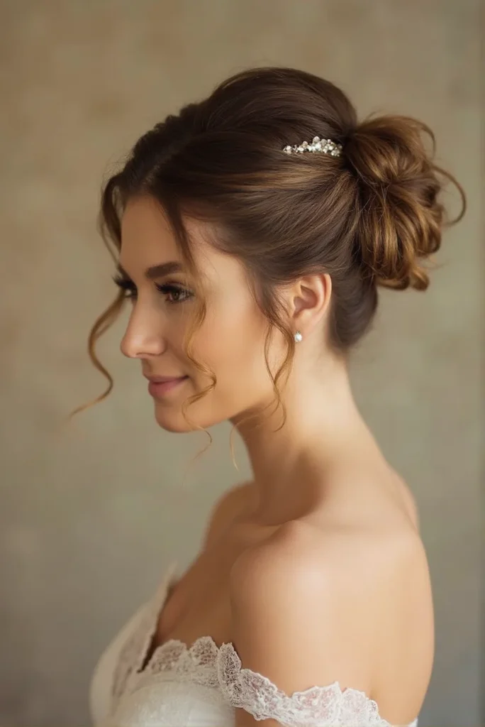 A small pearl accessory rests near the bun, giving the style a hint of shimmer without overwhelming its simplicity. Many bridesmaids love this bun because it stays secure while still looking airy and graceful throughout the celebration.