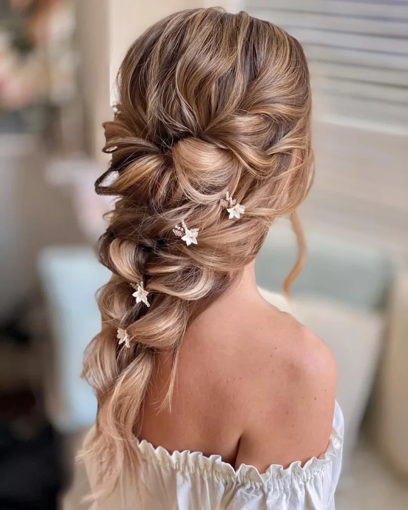 Small floral accents are tucked throughout the braid, adding sweetness and a touch of whimsy. Soft waves frame the face and blend naturally into the braid, creating a look that feels both effortless and polished.