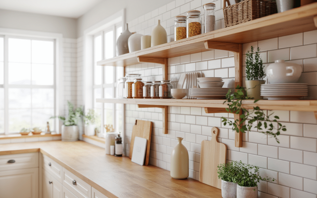 This cottage-modern open shelf setup shows how charm and function can share the same space with ease. Soft whites and warm wood tones set a calm mood, while simple decor pieces add quiet personality.