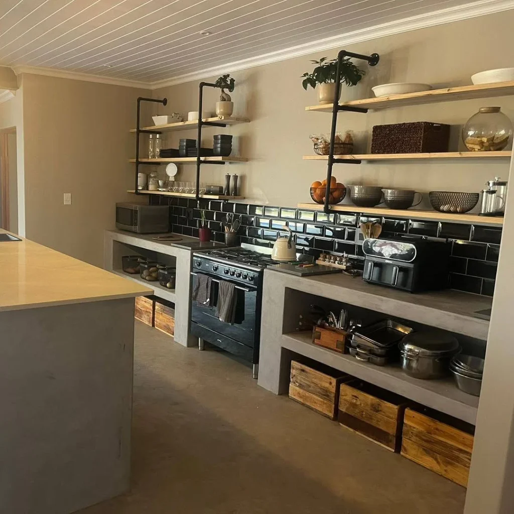 This industrial modern kitchen shows how open shelves can balance function with style in a simple, grounded way. Wooden shelves paired with black metal pipes give the room a clean, structural look that feels both practical and warm.