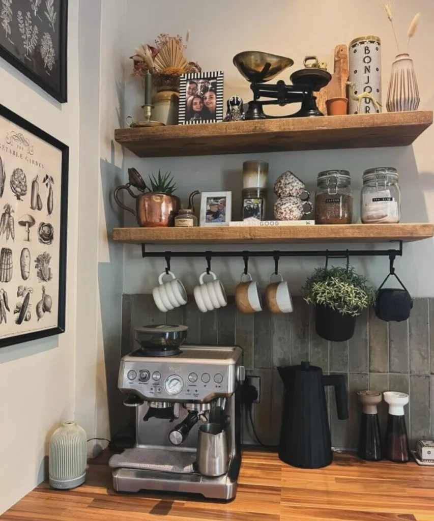 This modern rustic open-shelf setup creates a warm and lived-in coffee nook that feels both functional and personal. Natural wood shelves bring a grounded charm, while vintage pieces like the black scale and framed photos add a story-filled touch.