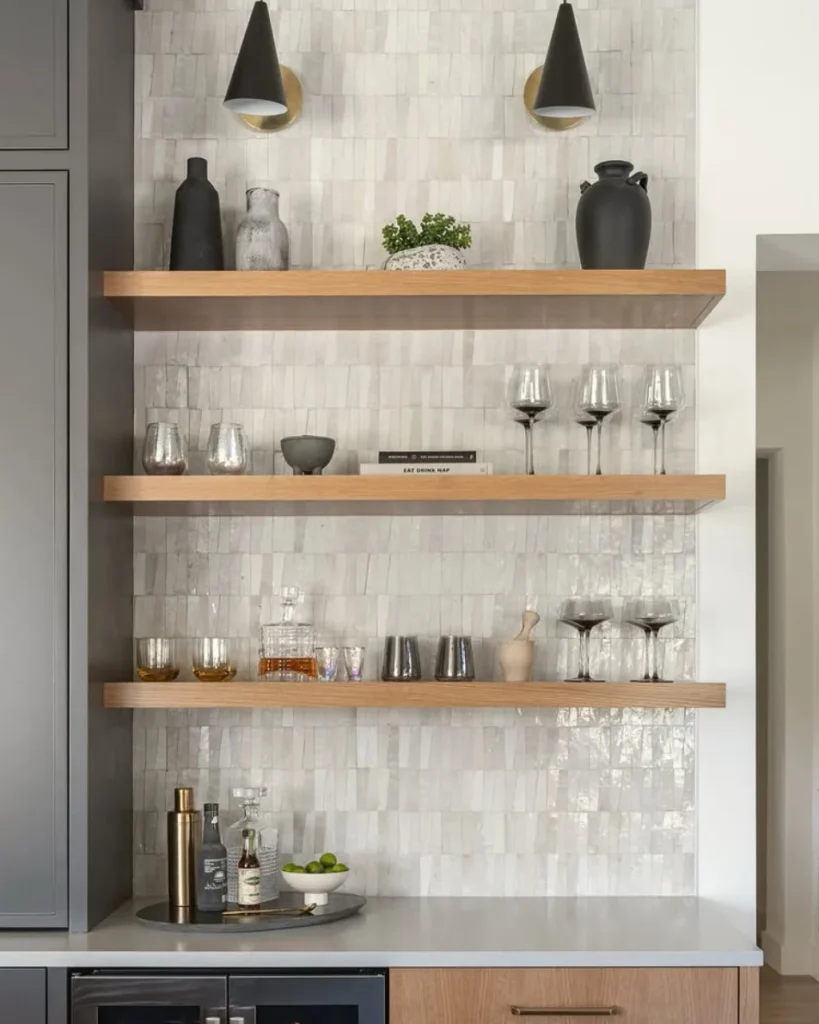 This modern open-shelf setup brings a sleek, curated rhythm to the kitchen. Simple wooden shelves float against a soft textured tile wall, giving every object room to breathe. Sculptural black and stone-toned vases add height on the top shelf, paired with a small planter that brings a touch of life.