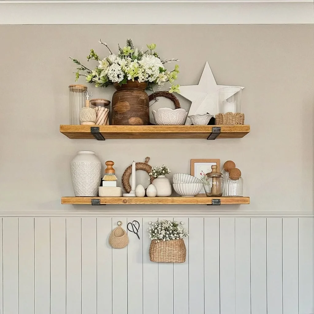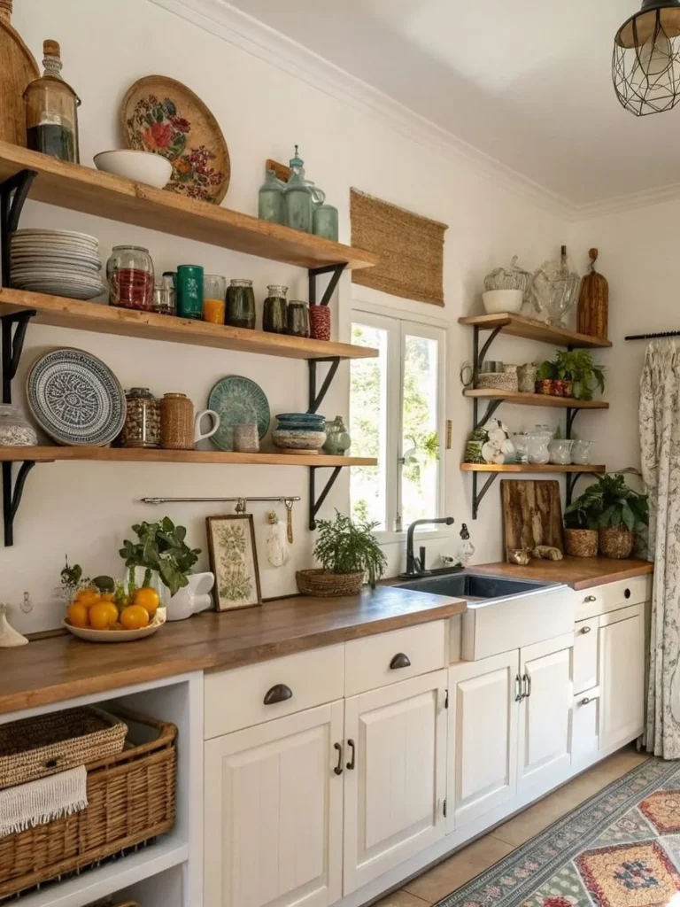 This warm rustic-modern kitchen shows how open shelves can bring charm, ease, and personality into a space. Natural wood shelves paired with black brackets create a clean, modern frame, while the mix of ceramics, woven baskets, and glass jars adds a grounded, lived-in feel.