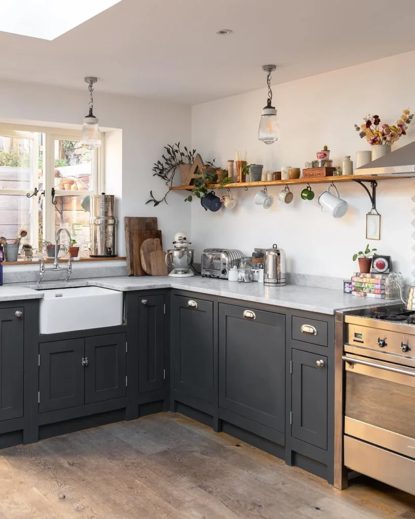 This cozy modern kitchen shows how one simple open shelf can shape the whole room with warmth and style. Natural wood paired with black brackets brings a gentle contrast to the charcoal cabinetry, setting a calm and grounded tone.