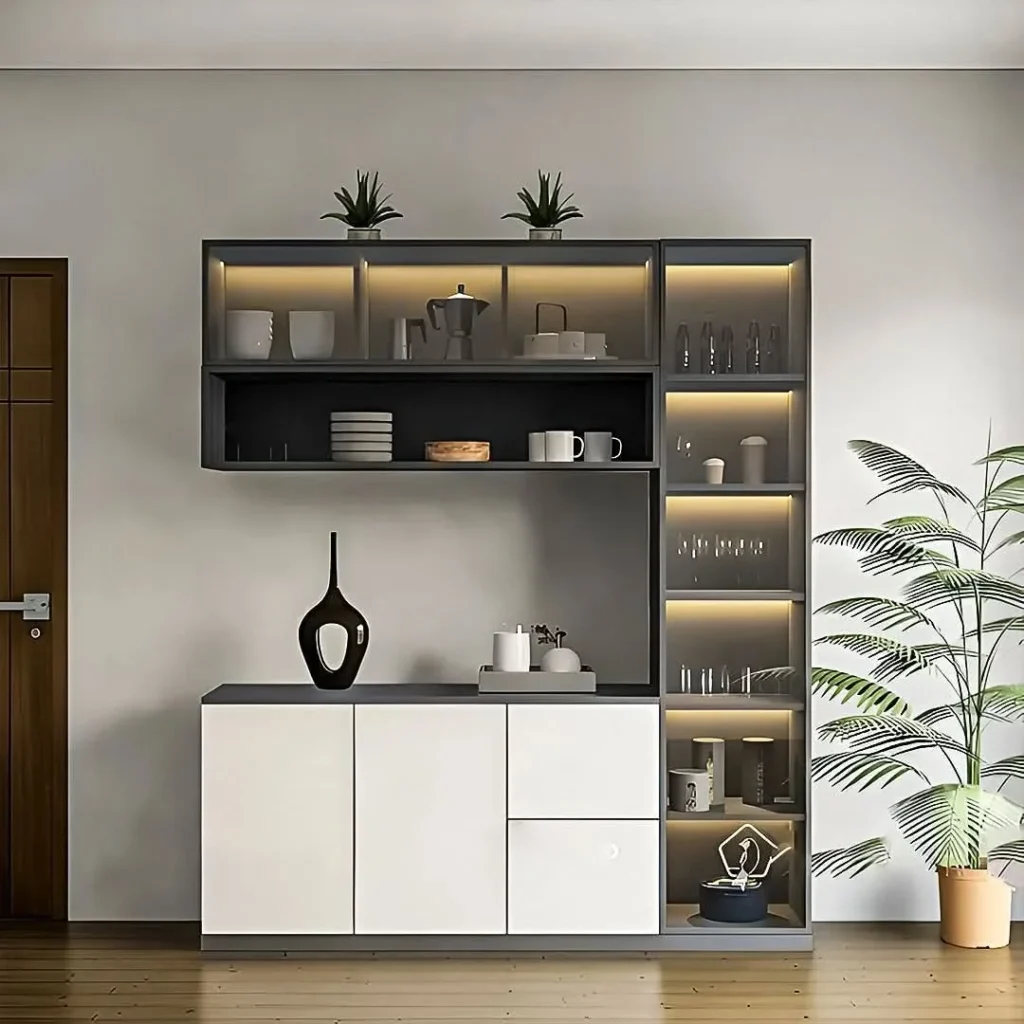 Warm lighting brings this modern open-shelf bar to life, giving the kitchen a stylish and inviting corner. Bottles are arranged neatly across the upper and middle shelves, with each label easy to reach and beautifully displayed.