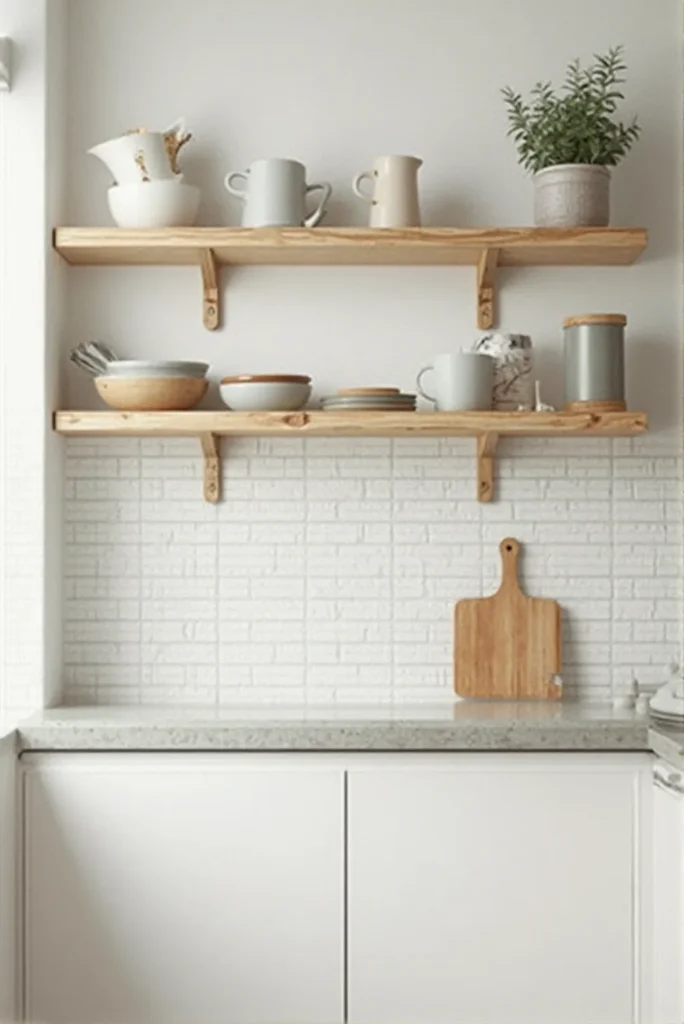 Soft tones and warm textures bring a calm rhythm to this modern open shelf design. Light wood shelves hold a small collection of mugs, bowls, and pitchers, each piece adding gentle charm without crowding the space.