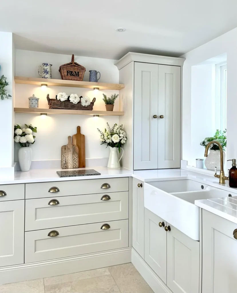 Below the shelves, a cake stand, wooden boards, and small sink accessories keep the counter styled yet usable. Every item has a place, and nothing feels rushed. This look works beautifully for anyone wanting open shelves that stay airy, warm, and thoughtfully arranged.