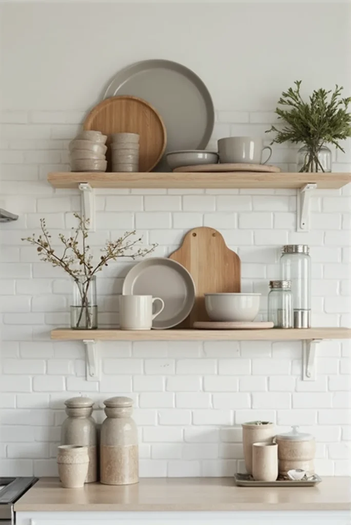 Warm neutrals and soft textures shape this modern open shelf moment. Gentle layers of stone-toned dishes rest against a white brick wall, giving the space a cozy and lived-in feeling. Light wood shelves add warmth, letting the ceramics and simple cookware stand out without overwhelm.