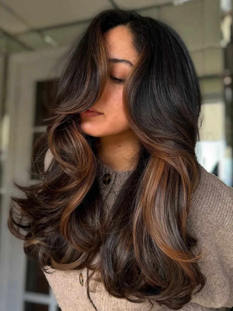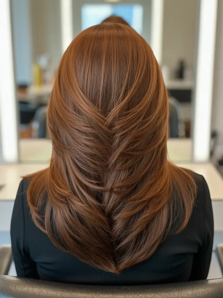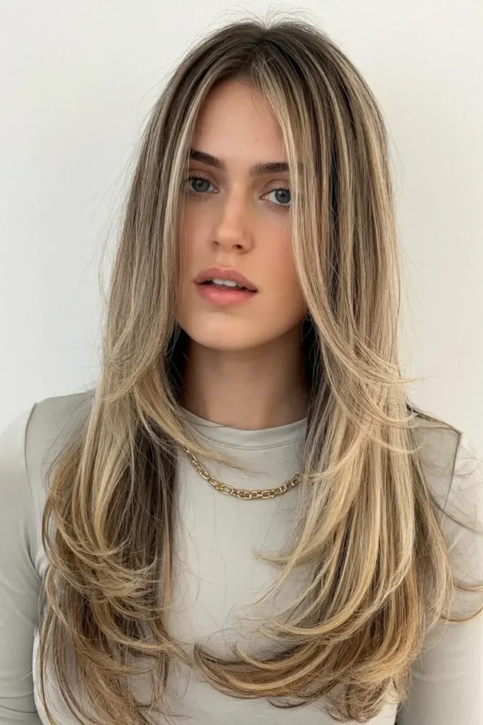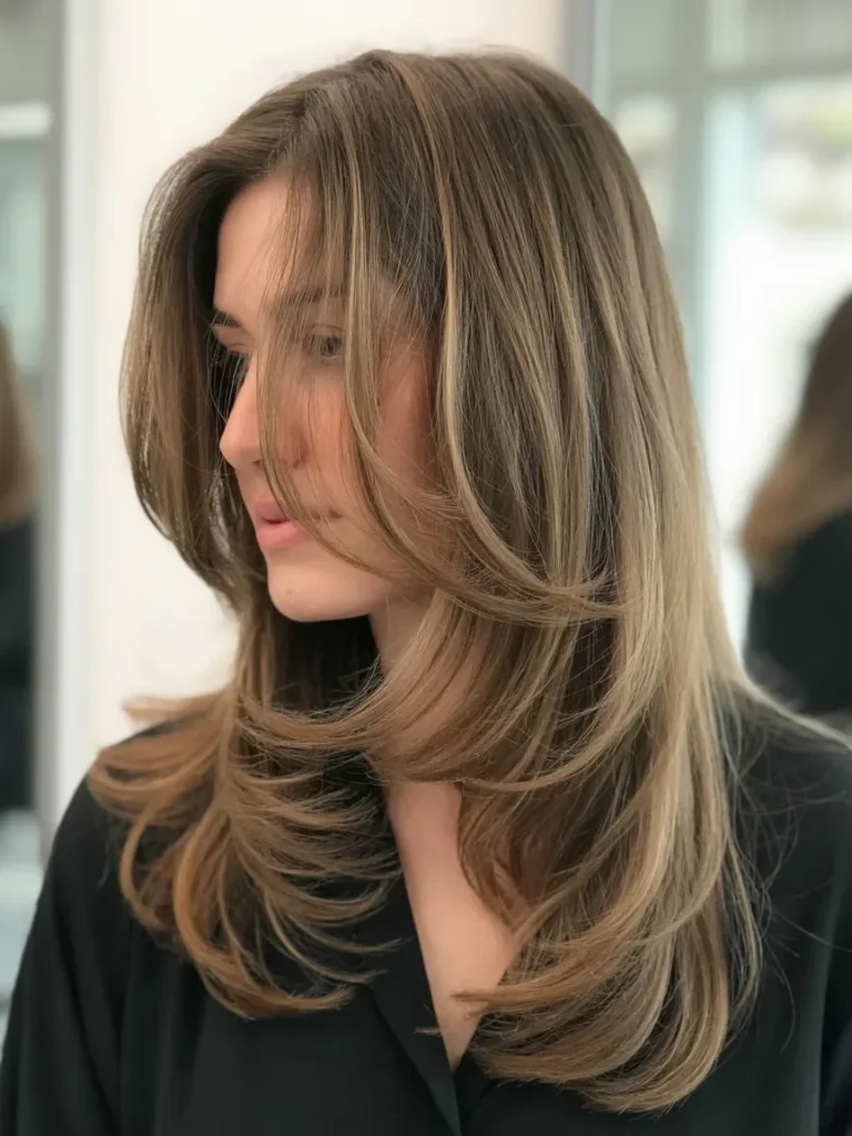 This layered haircut for long hair focuses on soft feathering that adds volume while keeping the length graceful. Light catching highlights move through the layers, creating a natural flow that feels airy and fresh.