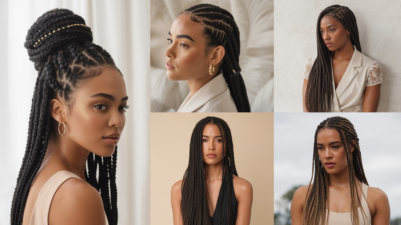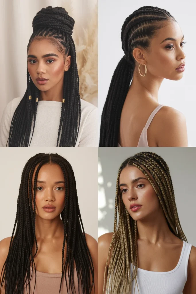 This image highlights long braided hairstyles for Black women with a beautiful mix of box braids, high bun, and sleek ponytail looks. Each style shows clean parting and smooth braid patterns that enhance the natural shape of the head.