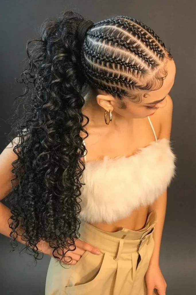 This image showcases a striking long braided hairstyle for Black women that blends neat cornrows with a full, curly ponytail. Cleanly braided rows are styled close to the scalp, creating a smooth and polished base that highlights precise parting.