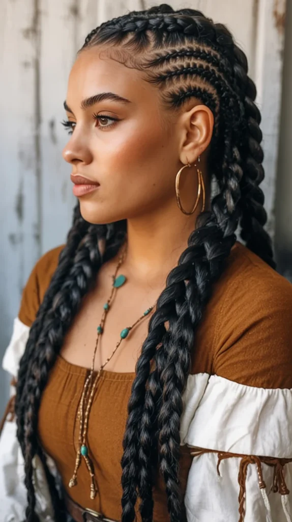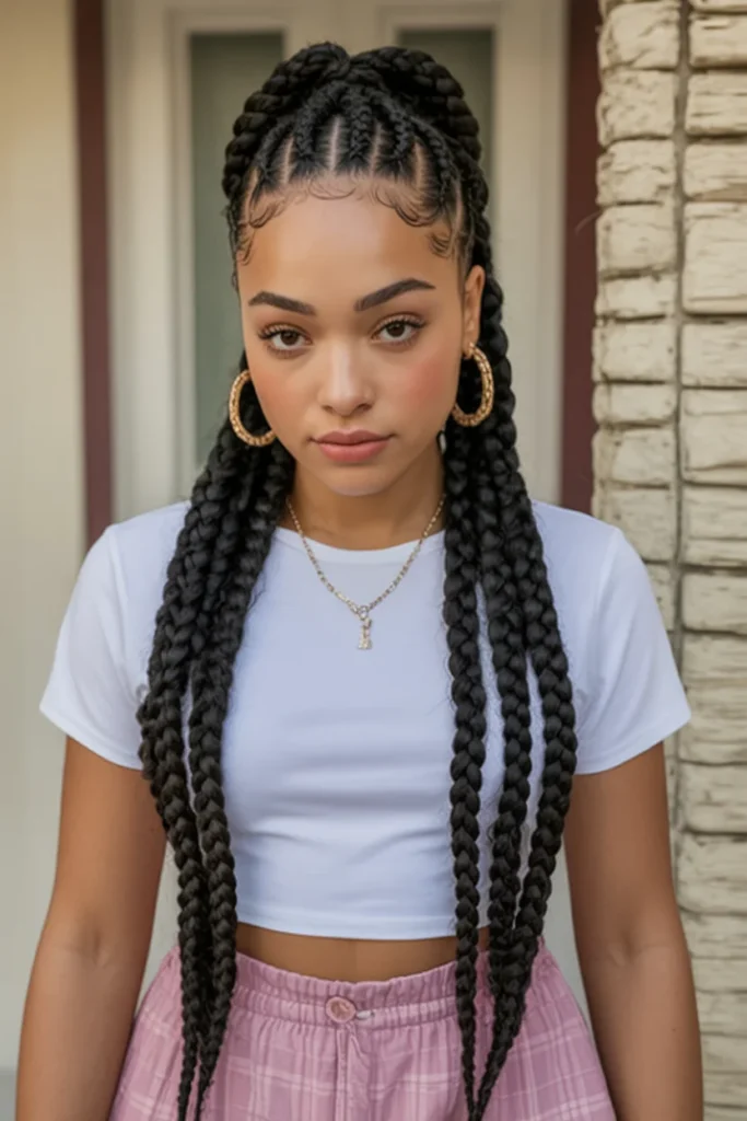The overall elegance is elevated by the large hoop earrings and delicate accessories, creating a perfect balance of bold and refined. This is a go-to style for those who want long braids that make a statement while remaining timeless.