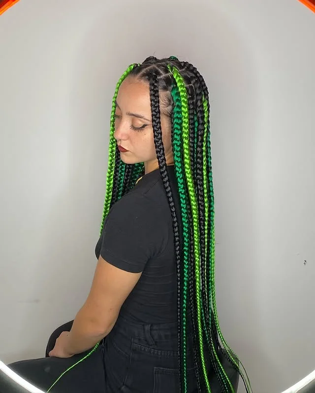 The striking green highlights add an edgy twist to the traditional look, giving it a vibrant, high-fashion appeal. The braids are styled to fall long and sleek, with the color gradually blending from dark to bright green.