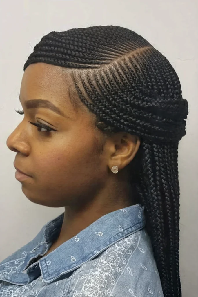 The braids are tightly woven at the scalp, giving a sleek finish that helps the style last while keeping it low maintenance. From the side profile, the braids fall straight down the back, adding length without overpowering the face.