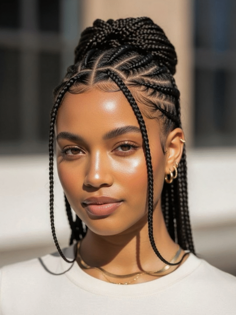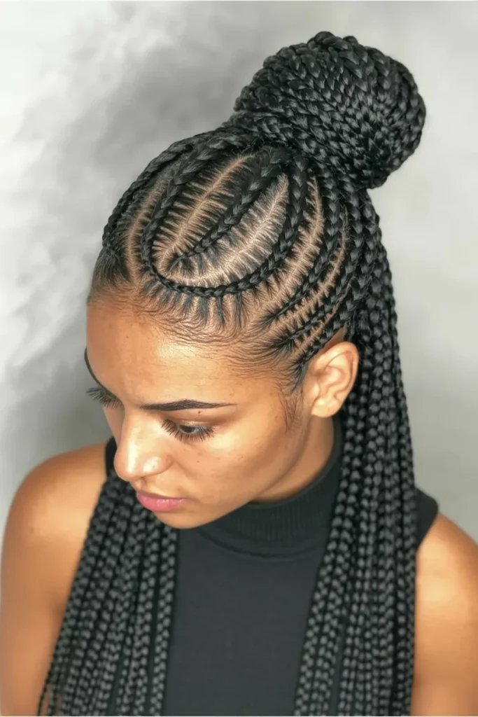 This striking braided style combines sleek box braids with a high bun, making it an elegant and eye-catching look for Black women. The braids are intricately woven, starting from the scalp with defined parts that add structure to the hairstyle.