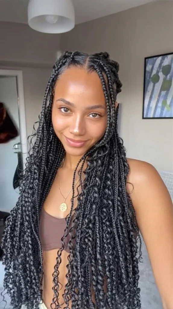 9. Long Box Braids with Curly Ends