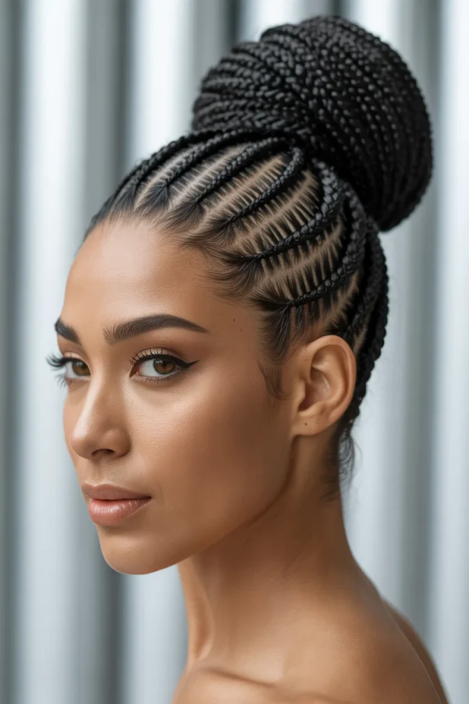 Soft baby hairs frame the hairline, adding a refined touch without overpowering the look. From the side profile, the braid pattern looks structured and balanced, giving the style a modern edge. The high bun keeps the braids secure while offering a graceful, elevated appearance.