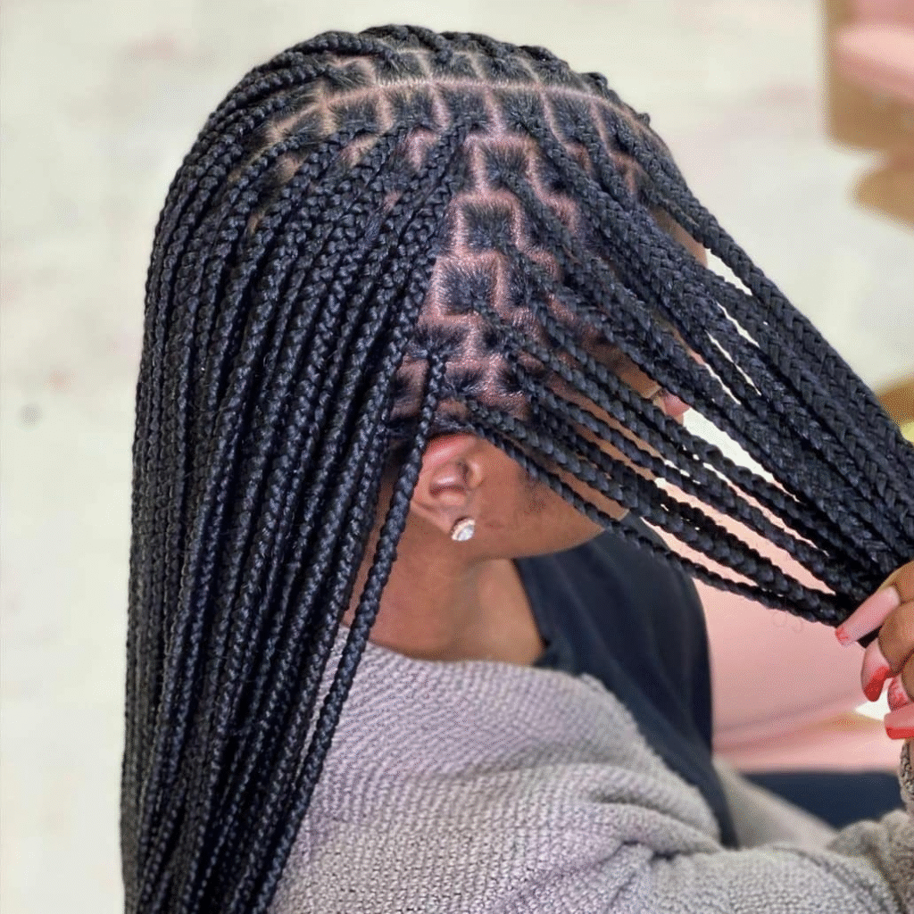This hairstyle showcases a clean and stylish take on long braided hairstyles. The neatly installed box braids are neatly sectioned with a geometric pattern, creating an eye-catching design.