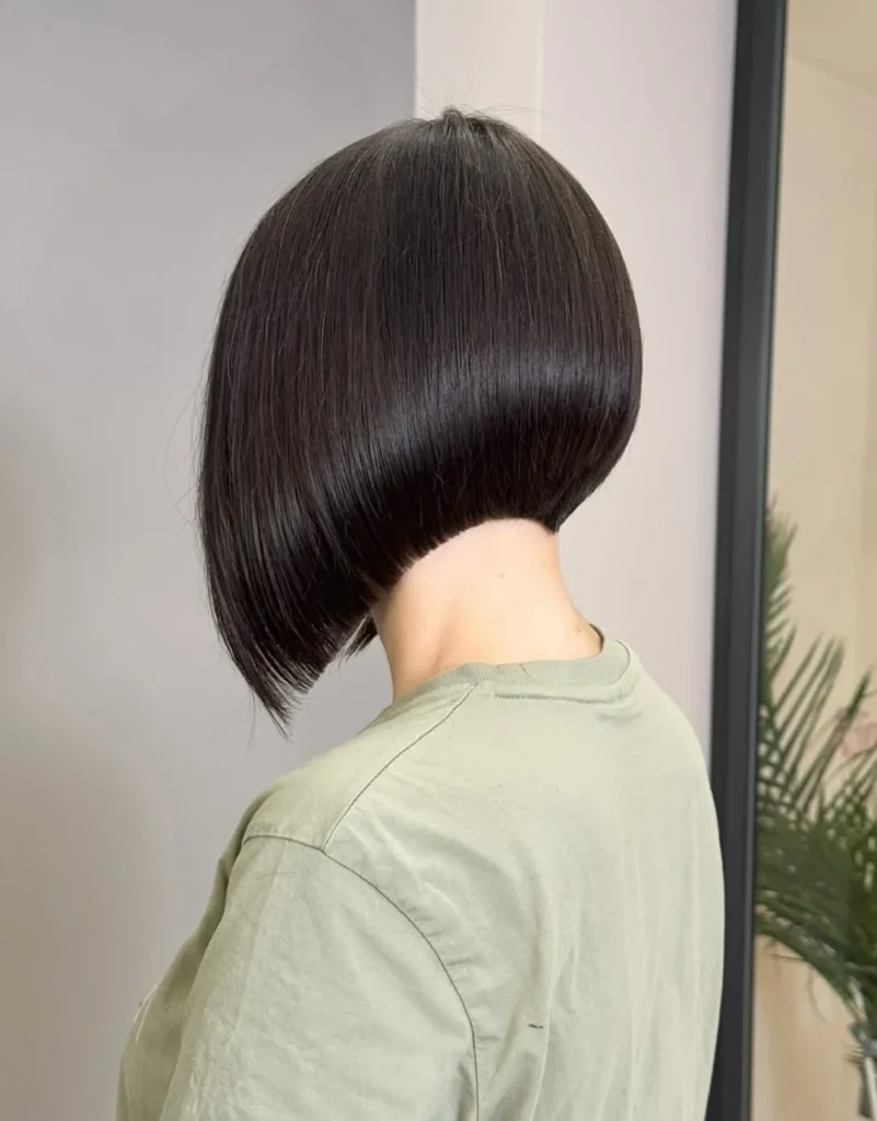 This sleek angled bob cut brings sharp structure and smooth definition to thick hair. The back sits clean and lifted, while the front drops into a longer point that shapes the jawline with quiet elegance. Every strand lies neatly, creating a polished curve that shows off the precision of the cut. The angled form gives natural volume at the crown, helping the style stay full without feeling heavy.
