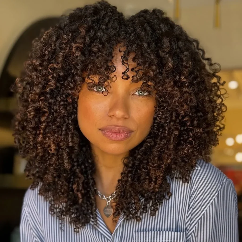 Warm brown highlights brighten the coils and add dimension throughout the style. Thick curly hair benefits from this cut because the layers reduce bulk while keeping volume strong and expressive. Styling stays simple, as the curls naturally form into this rounded, lifted shape with minimal effort. This look suits anyone wanting a fresh, voluminous cut with defined texture and a graceful, natural outline.