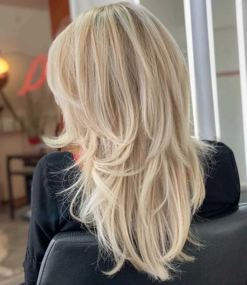 Cool blonde tones highlight the layers and enhance the soft, feathered texture. Thick hair benefits from this structure because it removes weight while keeping the body intact. Styling feels easy, as the layers naturally fall into place and create a graceful outline from every angle. This cut suits anyone who wants a refined, balanced shape with effortless movement.
