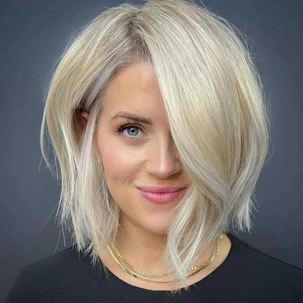 Cool blonde tones brighten the layers and give the haircut a fresh glow. Thick hair works well with this bob because the layering builds controlled volume while keeping the shape polished. Styling stays simple, as the natural structure helps the hair fall neatly with very little effort. This look suits anyone wanting a stylish, medium-length cut that blends lift, softness, and a crisp outline.