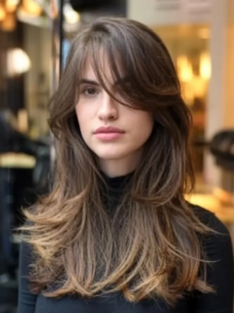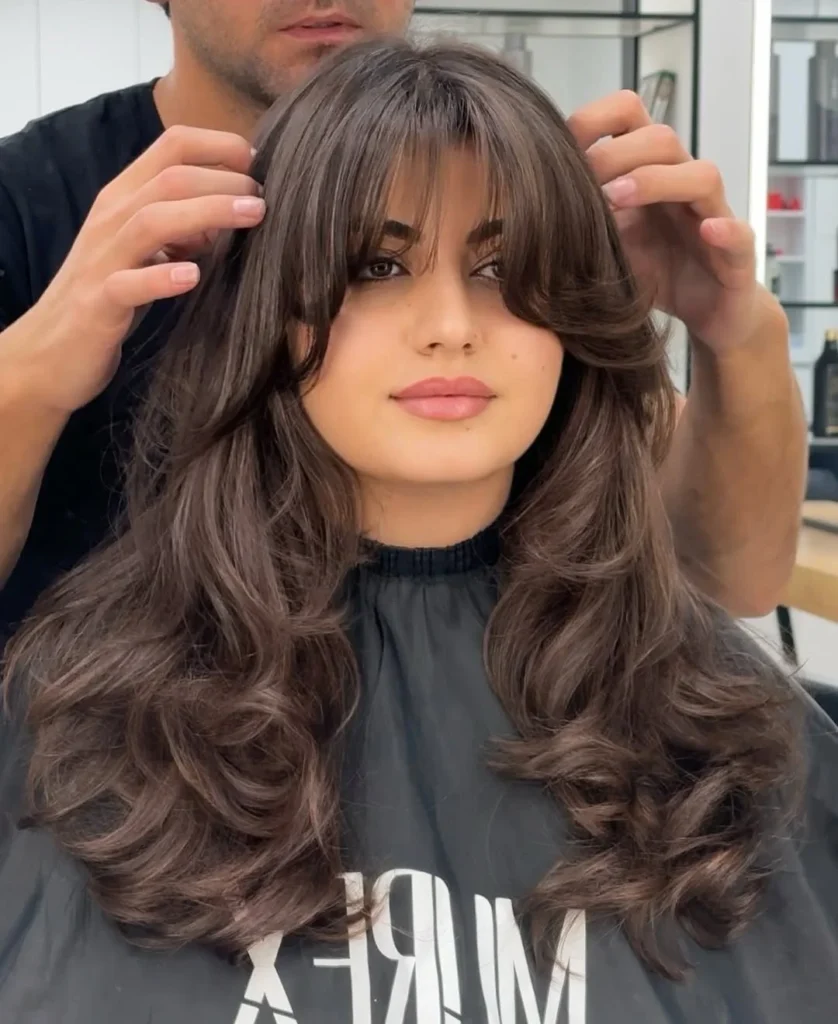 Deep brunette tones highlight the layers, creating depth and shine throughout the cut. Thick hair works beautifully with this shape, as the layers remove bulk while keeping the body strong. Styling stays simple because the natural structure helps the hair fall into place with clean, lifted edges. This look suits anyone wanting dramatic volume, smooth texture, and a graceful layered silhouette.