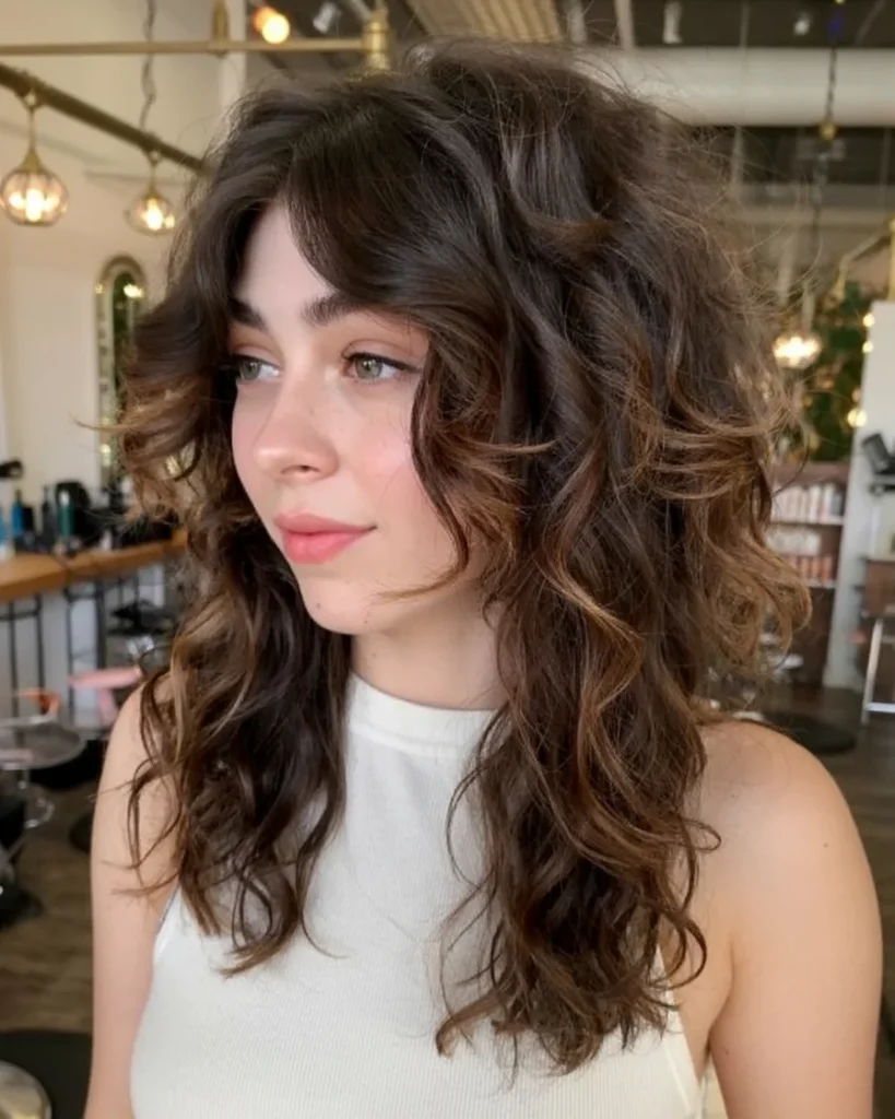 Thick hair benefits from this layered finish because it reduces bulk while keeping the body rich and expressive. Warm brown tones highlight the curls and add depth throughout the shape. Styling remains simple, as the layers help the curls form without extra effort. This look suits anyone who wants relaxed volume, enhanced texture, and a soft, airy outline.