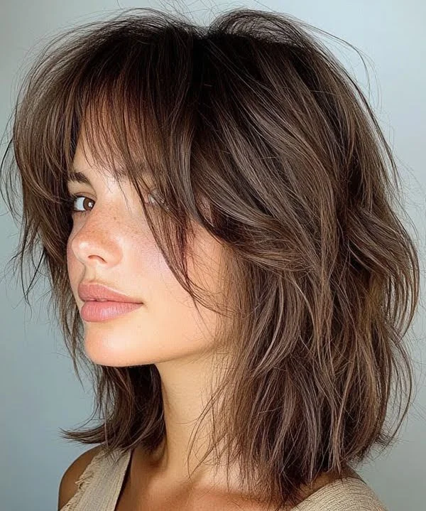 Rich brown tones highlight the layers and add depth throughout the shape. Thick hair responds well to this cut, as the layers remove bulk while keeping the volume rich and balanced. Styling stays simple because the natural texture does most of the work, creating an airy outline with very little effort. This look suits anyone wanting a modern, tousled finish with a soft, face-framing touch.