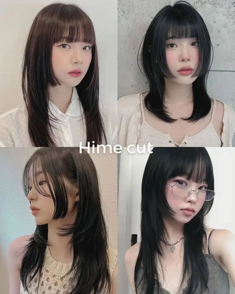 This layered Hime style brings a modern twist to a classic Japanese haircut, giving thick hair structure and softness at the same time. Straight, cheek-length side panels frame the face, creating a sharp contrast with the longer layers that fall smoothly down the shoulders. Each section moves with a light sweep, adding gentle volume without taking away the clean outline. The blunt fringe completes the look, opening the eyes and balancing the layered shape.