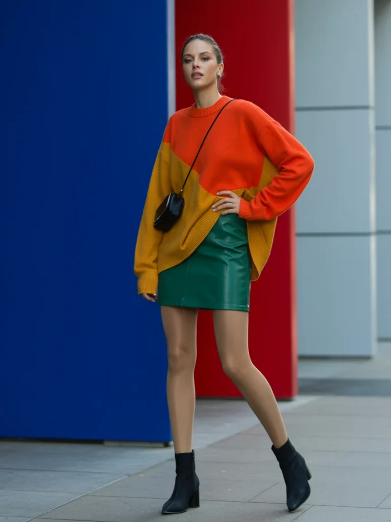 Every piece works with the next, creating a mix of bold color and effortless style. This outfit shows how an oversized sweater and mini skirt can turn a simple day into a standout fashion moment.