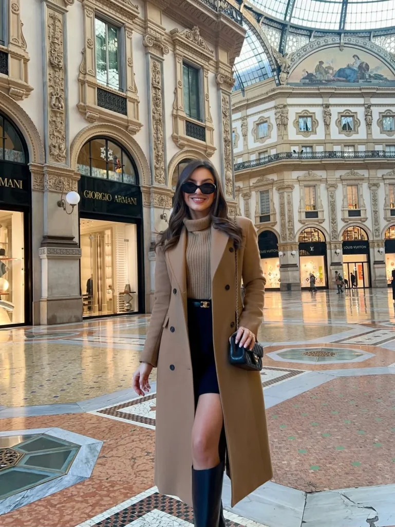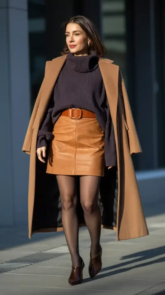 This outfit blends a mini skirt with an oversized sweater in the most polished way. A long camel coat adds structure and warmth, giving the look a refined, city-ready feel. The ribbed turtleneck sweater brings softness and comfort, creating a smooth contrast with the sleek mini skirt underneath.