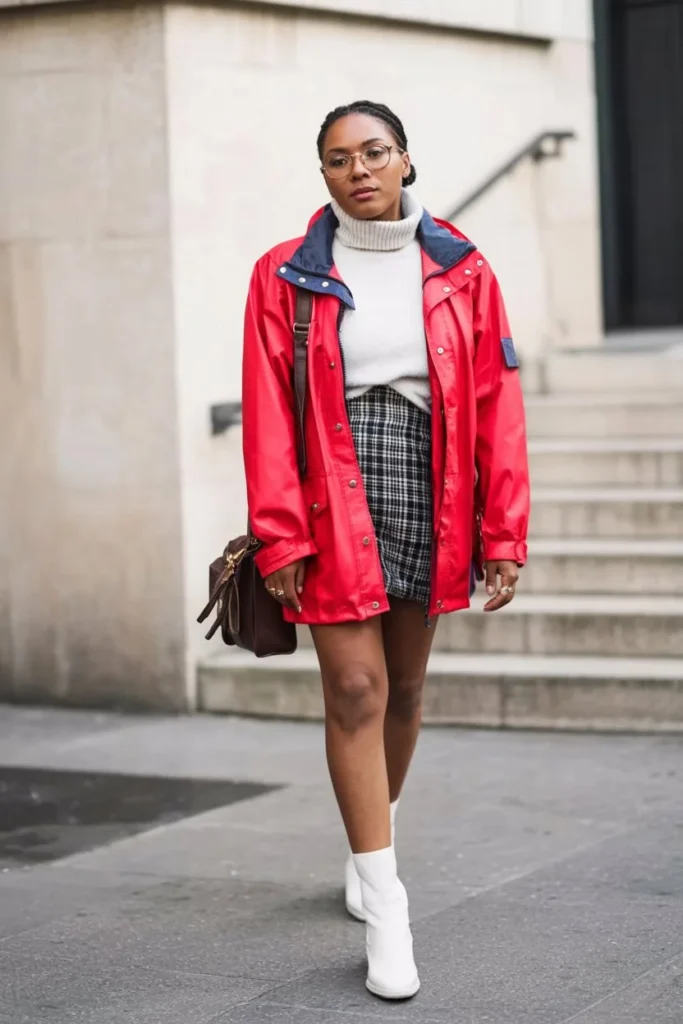 A bright red jacket adds energy and movement, making the outfit stand out instantly. Her white ankle boots lift the whole look with a clean finish, while the dark leather bag grounds it with a touch of everyday practicality. The mix of textures works well together, and each layer brings its own charm.